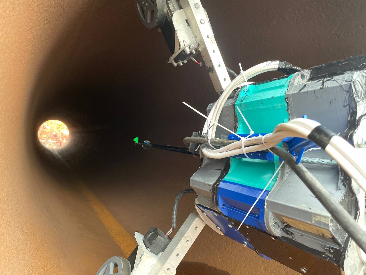Передвигается он с помощью шести опорных ног с пружинными подвесками. Такая конструкция позволяет всем двенадцати ведущим колесам постоянно сохранять контакт со стенкой трубы, даже на неровностях и крутых поворотах до 90 градусов. Управляет движениями агрегата интеллектуальная система, которую контролирует оператор.
