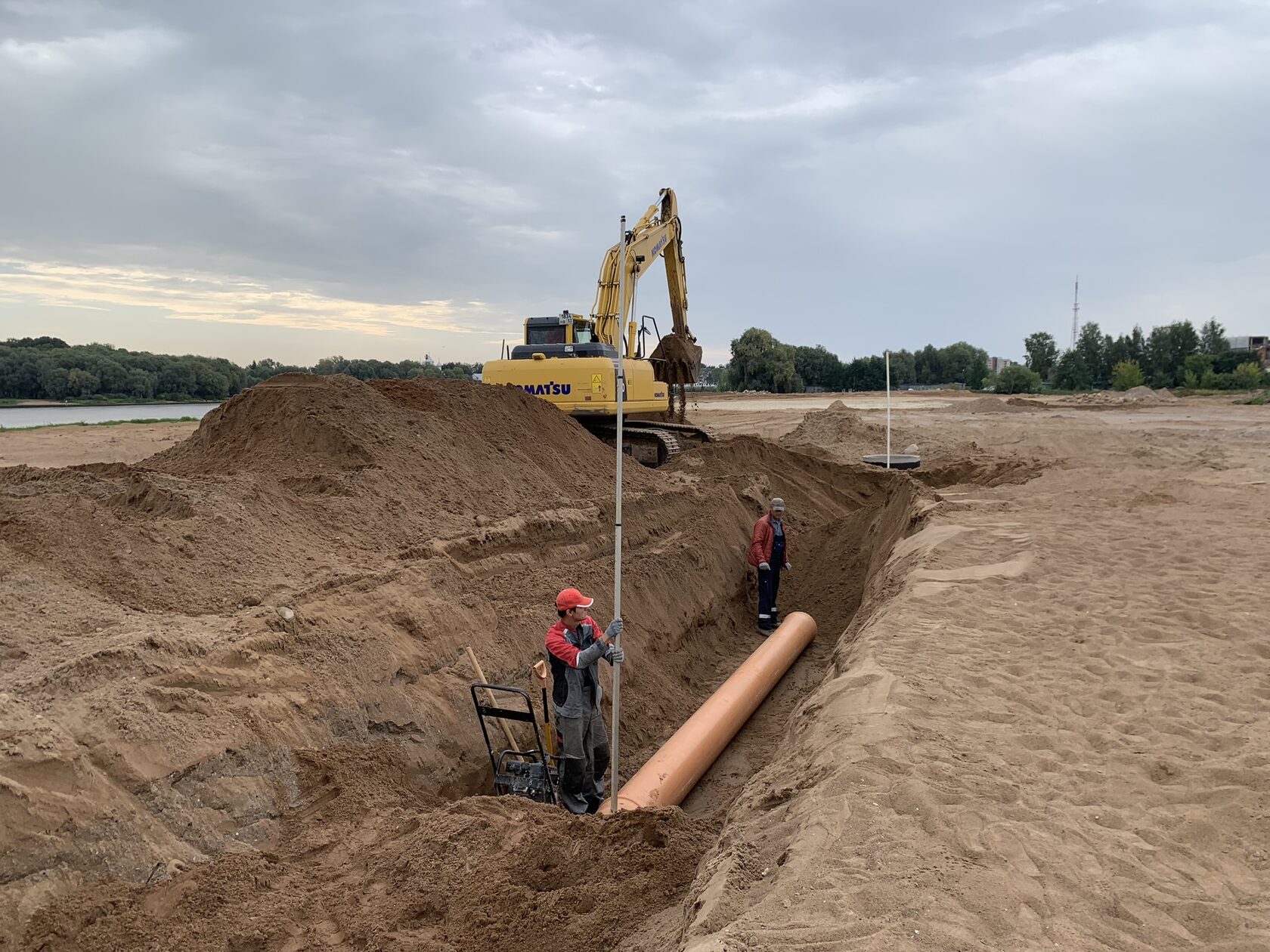 - Выполнение расчетов и составление схемы земляных работ с определением уклона и габаритов канализационных труб, глубины их прокладки, параметров и конфигурации траншеи, необходимости выполнения песчаной подушки на отдельных участках и так далее;